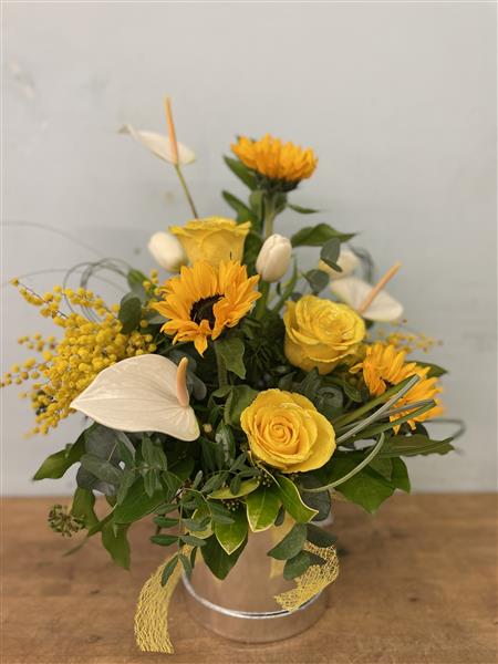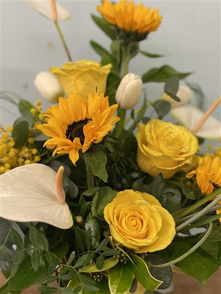A fresh and uplifting arrangement of sunny yellow and soft white blooms, thoughtfully combined with mixed seasonal flowers and complimentary foliage. Designed with texture and movement in mind, this arrangement brings a natural, garden inspired feel and is perfect for brightening any space or sending a thoughtful message for any occasion.